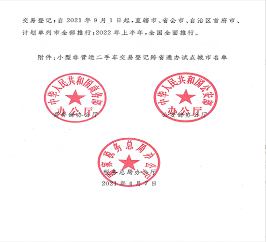 此外,《通知》對政策落地實施進度做瞭(le)具體部署,明確(què)2021年6月1日起,在天津、太原、沈陽、上海等20個城市(名單見附件)試點推行小型非營運二手車異地交易登記;自2021年9月1日起,直轄市、省會市、自治區首府市、計劃單列市全部推行;2022年全國全面推行。