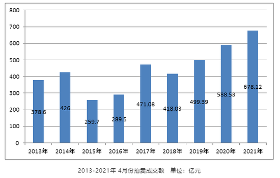 據“全國拍賣行業管理信息系統”統計,4月份,全國拍賣企業拍賣成交場(chǎng)次9249場(chǎng),較去年同期增加2064場(chǎng),實現成交額678.12億元,成交額同比增長(zhǎng)15.22%,爲2013年以來同期行業成交額最高值(見圖)。