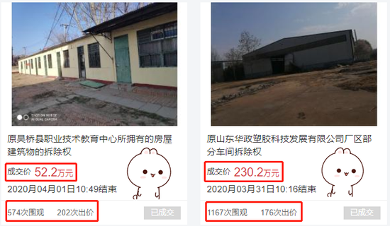 翻閱中拍平台線上成交的拆除權拍賣,並不在少數,而且成交結果也讓人眼前一亮!如下圖所示,近期在中拍平台成交的拆除權。在成交價格、圍觀次數還有競價次數上來看,都說明瞭其受市場的歡迎程度。拍賣確實也爲拆除權的處置提供瞭更多可能性!網絡拍賣不僅讓拆除權拍賣變得更加便捷,還能吸引到全國買家的參與!